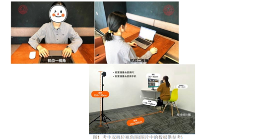 3.考生考场设立“双机位”,即主机位和副机位。主机位,主要用于回答复试专家的问题。主机位可以使用电脑带摄像头、话筒(推荐),也可以使用智能手机。副机位为考生另一部智能手机,主要用于考生考场的视频监考,要求画面清晰,手机固定于考生侧后方大致1.5米远高的位置,以视频中能显示考生及考生操作台的全景为宜(见图1)。